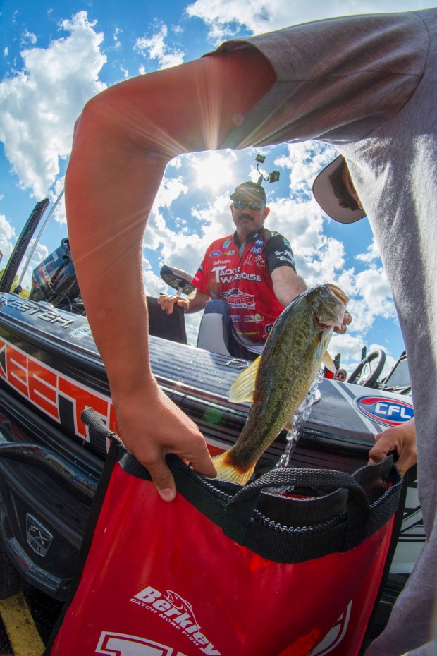 Randall Tharp brings the winning fish to stage Randall Tharp jacks the winning fish on the Arkansas State campus stage. Photo by Joel Shangle.