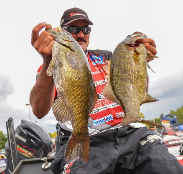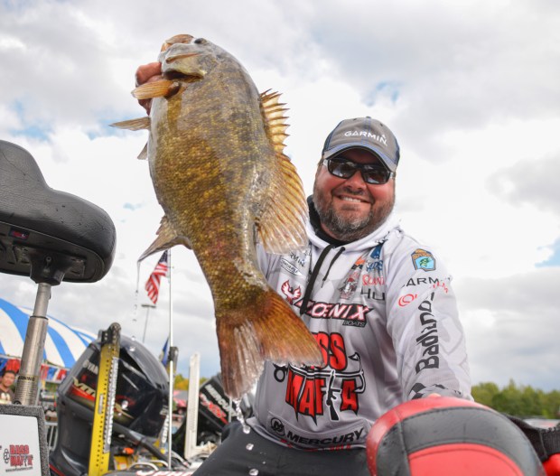 greg-hackney-with-his-pb-smallmouth-on-day-2 Garmin pro Greg Hackney with his personal-best smallmouth on Day 2: 6-0 pounds. Photo by Joel Shangle.