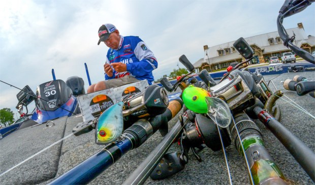 Alton Jones tying tackle before Wheeler Lake Alton Jones does some tackle prep before heading out. Photo by Joel Shangle.