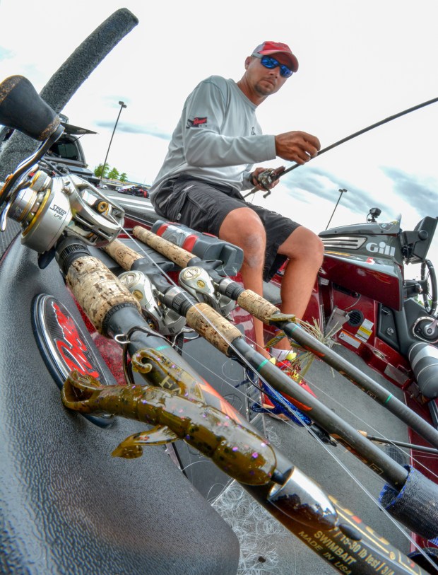 Jason Christie tying YUM gear before Wheeler Lake Jason Christie makes some tackle tweaks before Day 1. Photo by Joel Shangle.